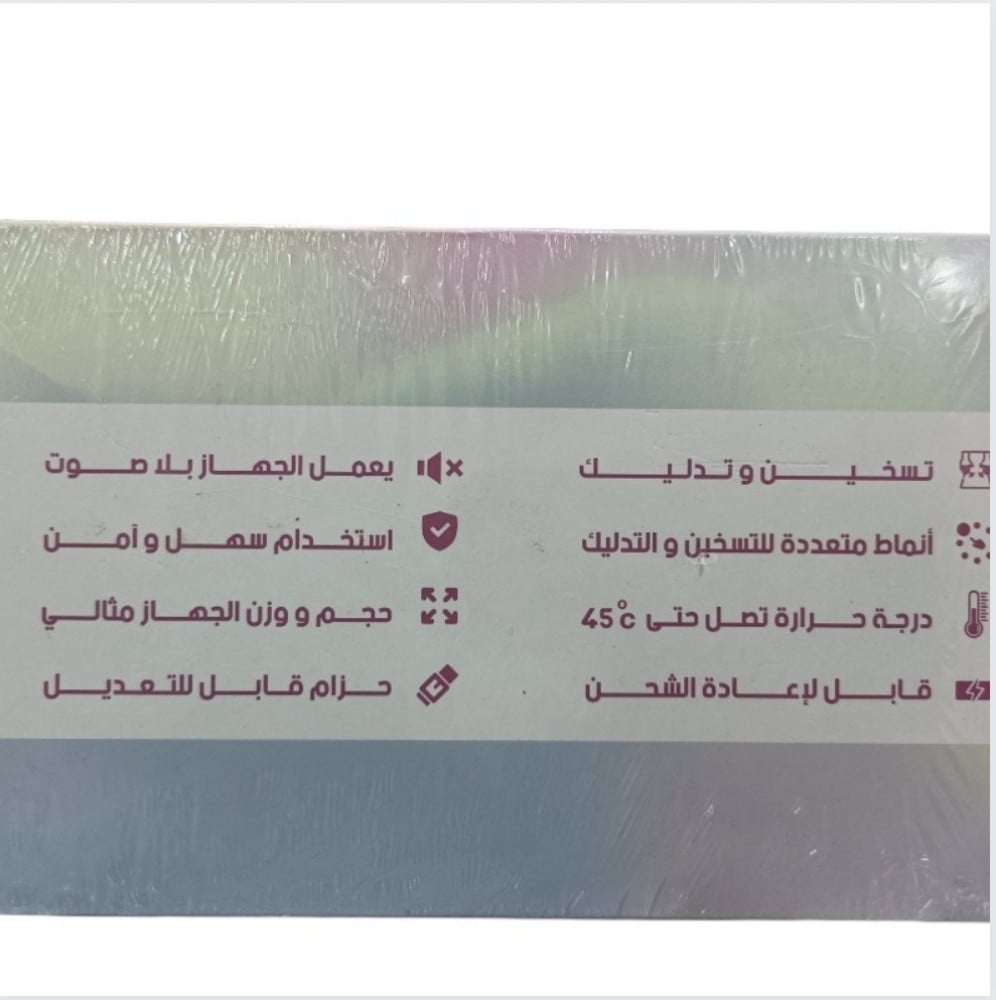 تسخين وتدليك -يعمل الجهاز بلا صوت -انماط متعدده التسخين -استخدام سهل وآمن -درجه حراره تصل إلى 45C-حجم وزن الجهاز مثالي-قابل لإعادة الشحن -حزام قابل للتعديل
